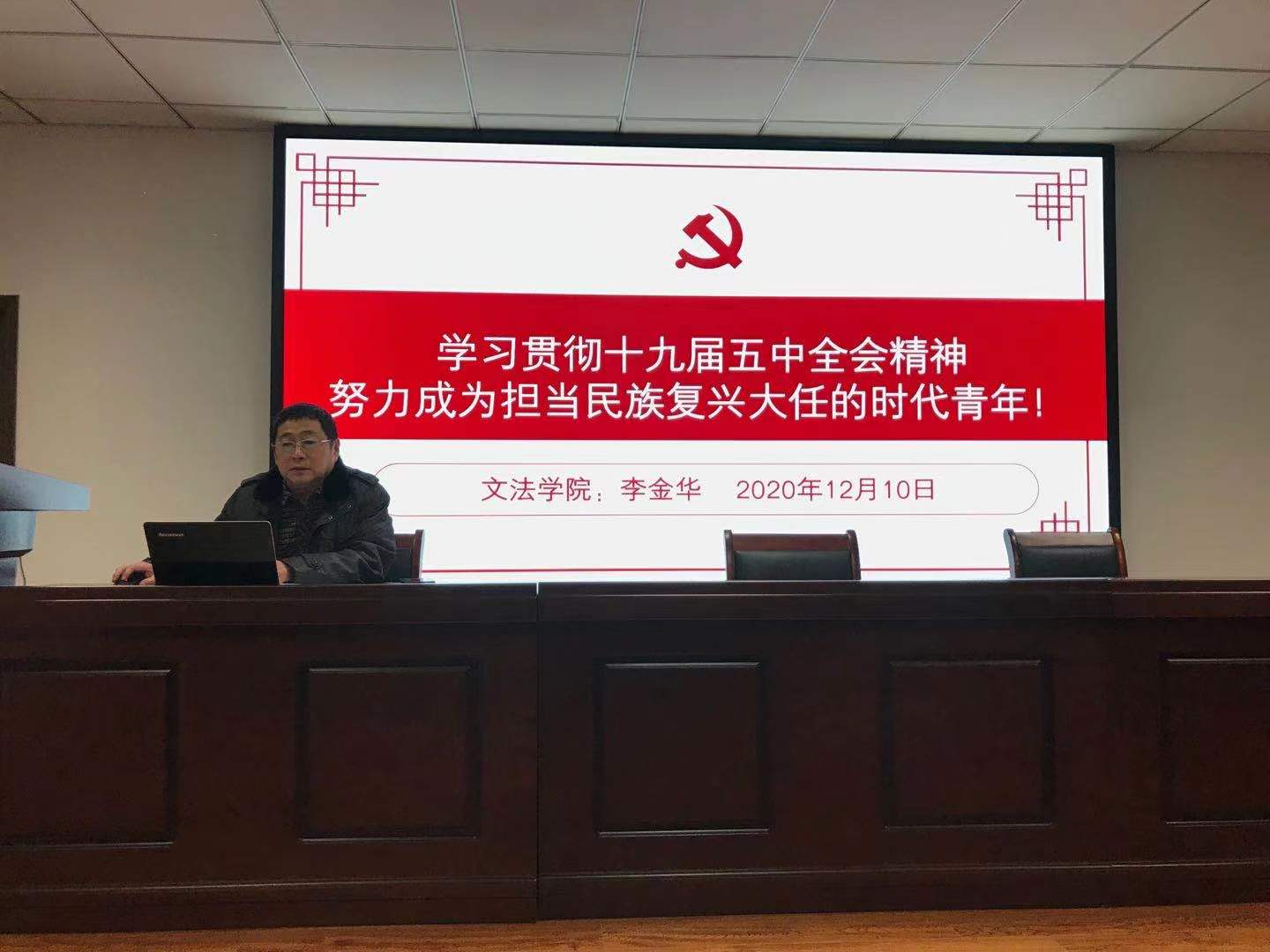 2020年12月10日,金沙威尼斯欢乐娱人城研究生法律(法学)党支部在金沙威尼斯欢乐娱人城楼509会议室召开了会议,支部全体党员参加会议,院党委书记李金华做了“学习贯彻十九届五中全会精神,努力成为担当民族复兴大任的时代青年”的宣讲报告。